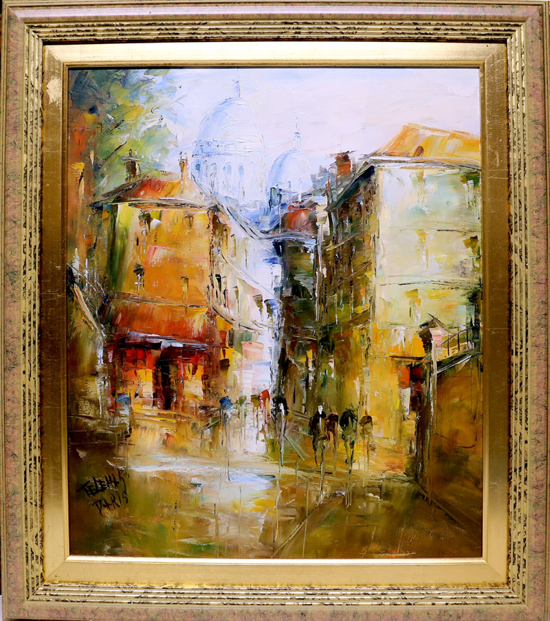 This piece is both sophisticated and fascinating. It would be perfect for display in an office or sitting room where it can be appreciated. The painting measures 16" wide X 12" high. The total measurement of the painting and frame is 23.25" wide X 19.25" high. Has damage on canvas. Left lower corner.