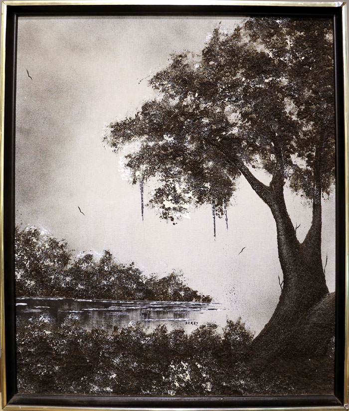 C. Lewis Perez was an artist of extraordinary talent who is best known for landscape paintings featuring three dimensional or raised trees, bushes and leaves. Perez, whose real name was Chester Lewis (1923-2010), worked also under the trade names "Louis Perez," "Lewis Perez" and often simply "Perez" throughout the 1970's, 80's and 90's until his unofficial retirement from painting around year 2000. Perez began his career as an artist in the Old Town area of Chicago and later moved his studios and residence to suburban Northwest Indiana. Prior to becoming an artist, Perez was an Illinois registered pharmacist and his curiosity and knowledge of chemical compounds led him to develop a type of paint that resulted in a three-dimensional subject that is extremely durable, easy to clean, and simply unlike any other painting on the market of the time. The painting measures 20" wide X 24" high. The total measurement of the painting and frame is 21" wide X 25" high
