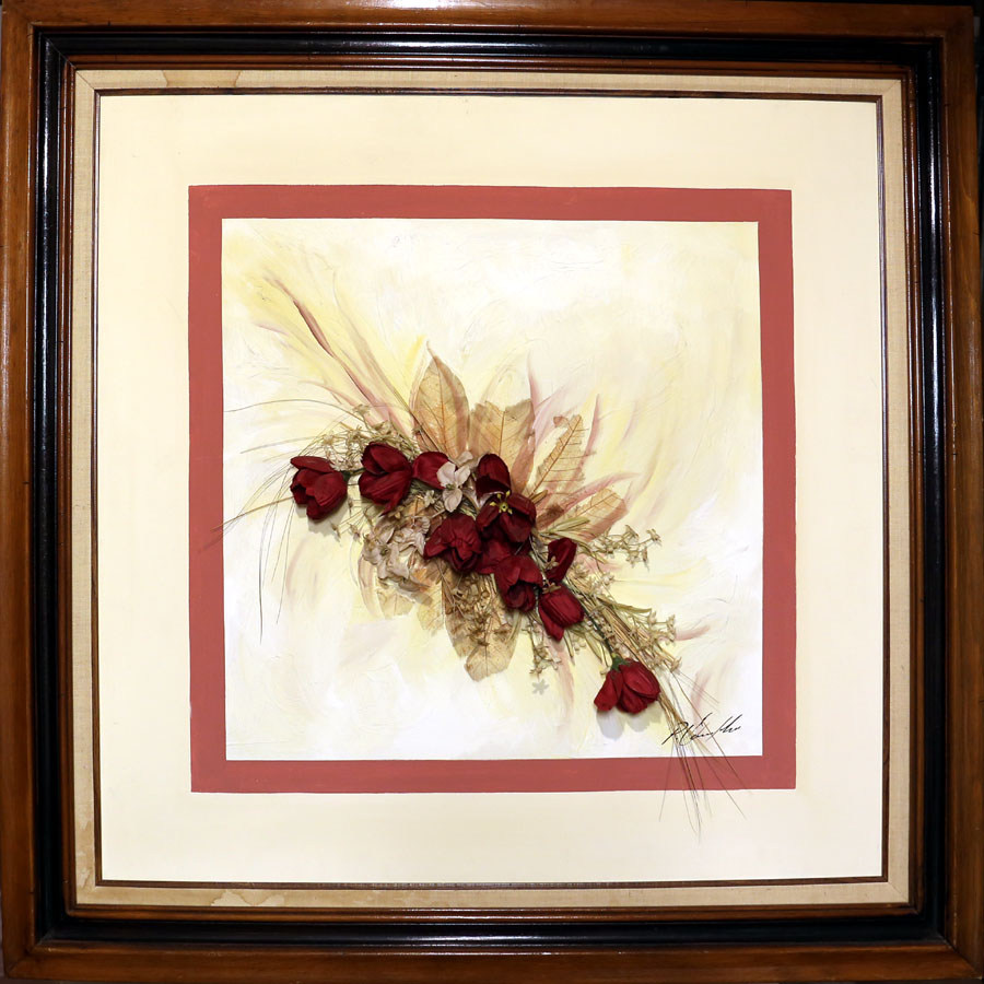 The painting measures 36" wide X 36" high. The total measurement of the painting and frame is 44" wide X 44" high