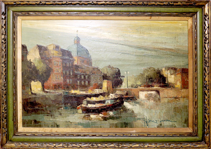 damaged with wine The painting measures 36" wide X 24" high. The total measurement of the painting and frame is 44" wide X 32" high